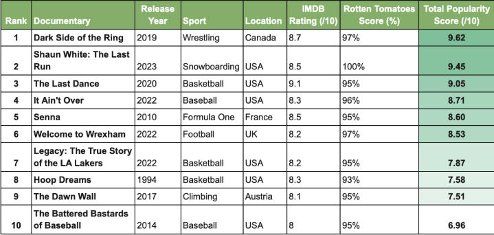 - Finally, the documentaries were ranked by average rating, from highest to lowest, to reveal our favourite sport documentaries of all time.